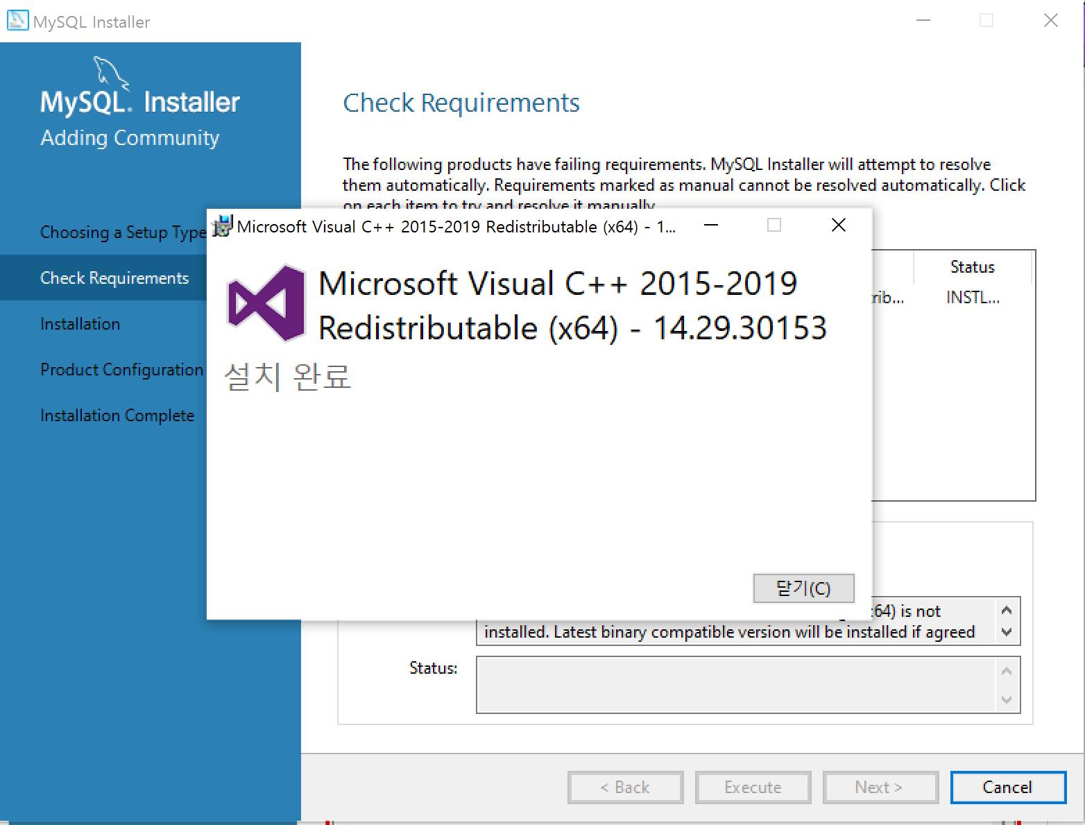 MySQL를 설치를 위한 Microsoft Visual이 필요하여, Execute 버튼을 눌러줍니다.