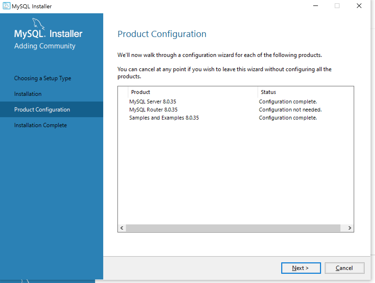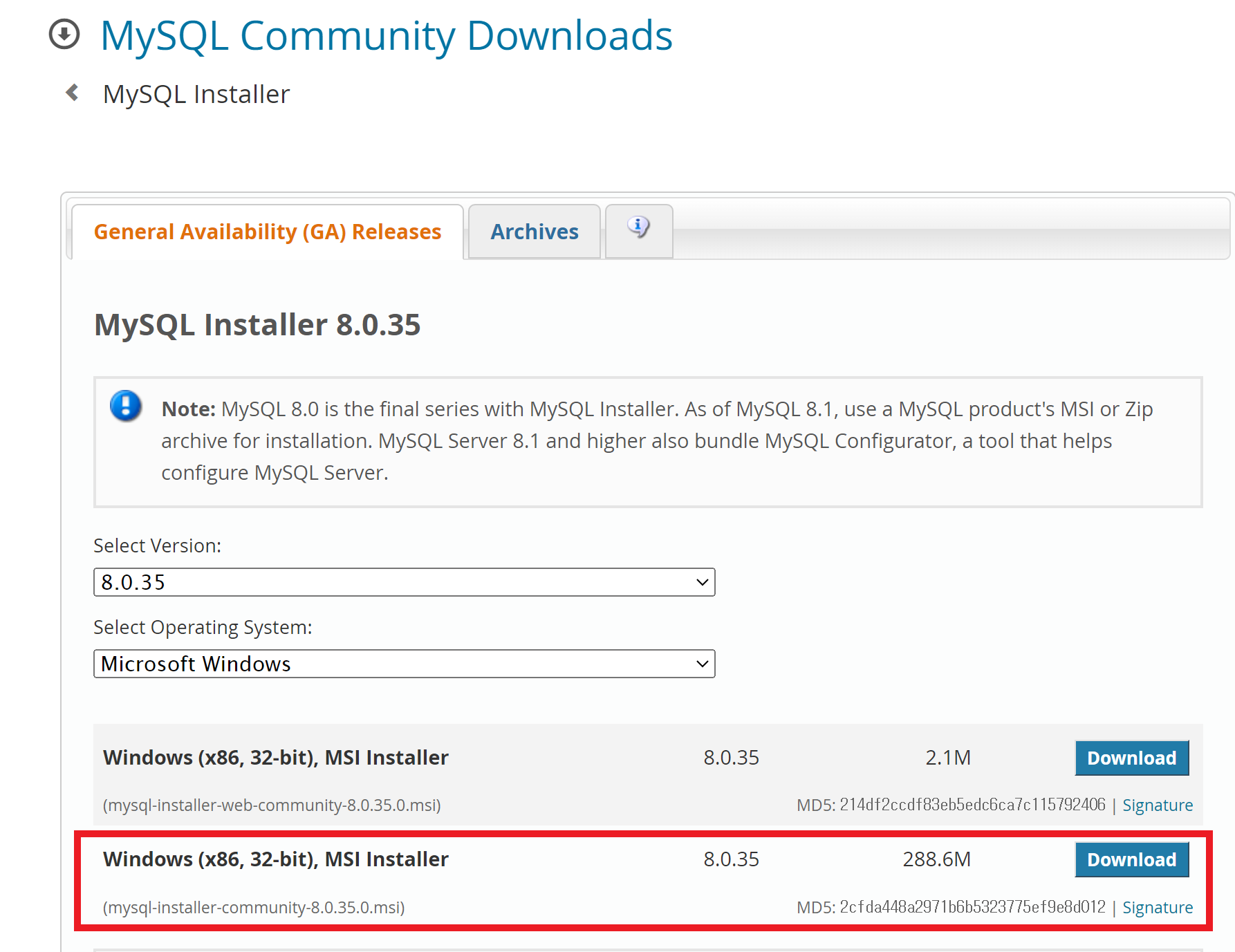 - mysql-installer-community-8.0.35.0.msi: 인터넷 연결 없이 설치하는 full package