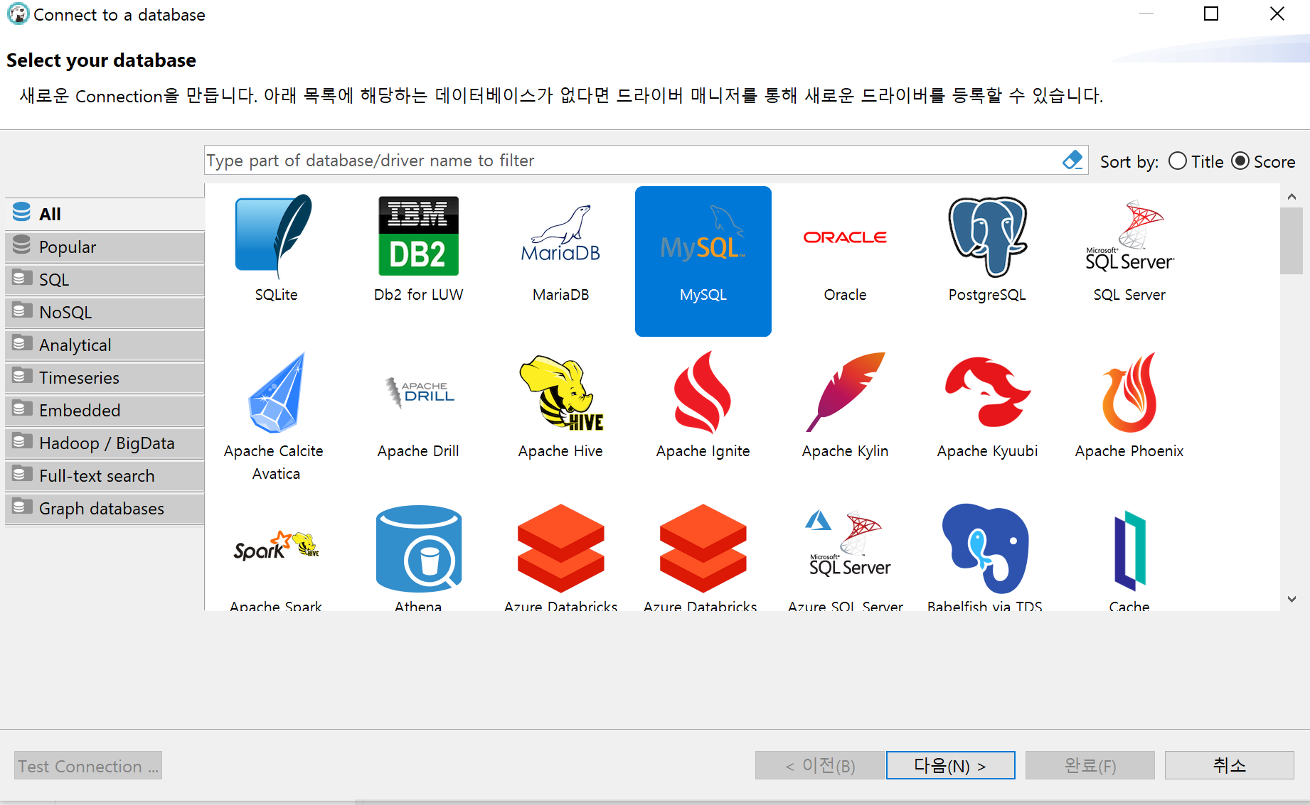 연결할 수 있는 다양한 Database를 지원합니다. 우리는 MySQL을 설치했기 때문에 해당하는 것을 클릭합니다.