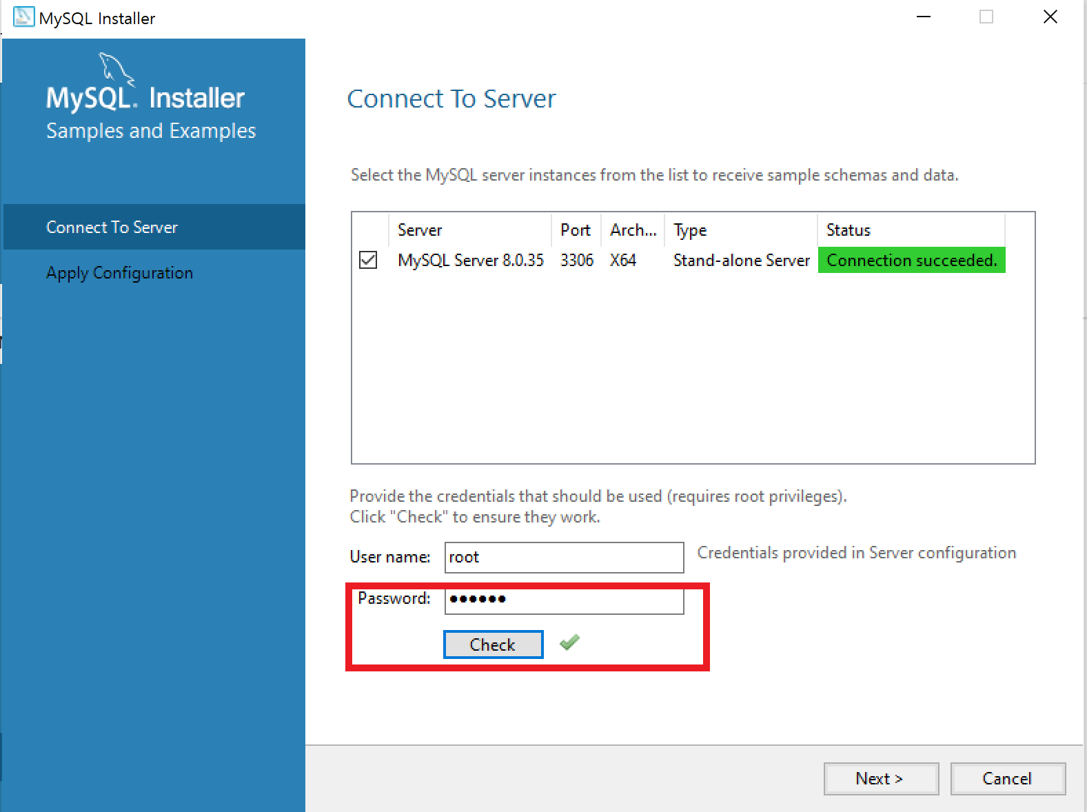 MySQL 설치시 설정한 Password를 넣어줍니다. Username은 기본적으로 root로 설정되어있어서 변경하지 않아도 됩니다.