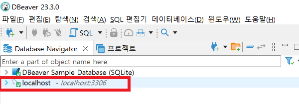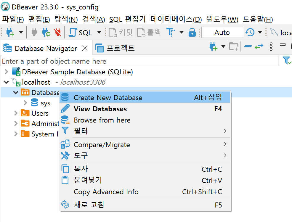 localhost의 좌측 꺽쇄를 누르니 sys 라는 Database밖에 조회되지 않았습니다. 기본적으로 필수적이지 않은 Database는 숨겨진 채로 DBeaver에서 조회할 수 없네요. 또한, sys 이름으로 유추하건데 시스템 정보에 관한 데이터베이스므로, 테이블을 생성하는 등 작업에 적합하지 않아 보여 새로운 데이터베이스를 생성해보겠습니다.