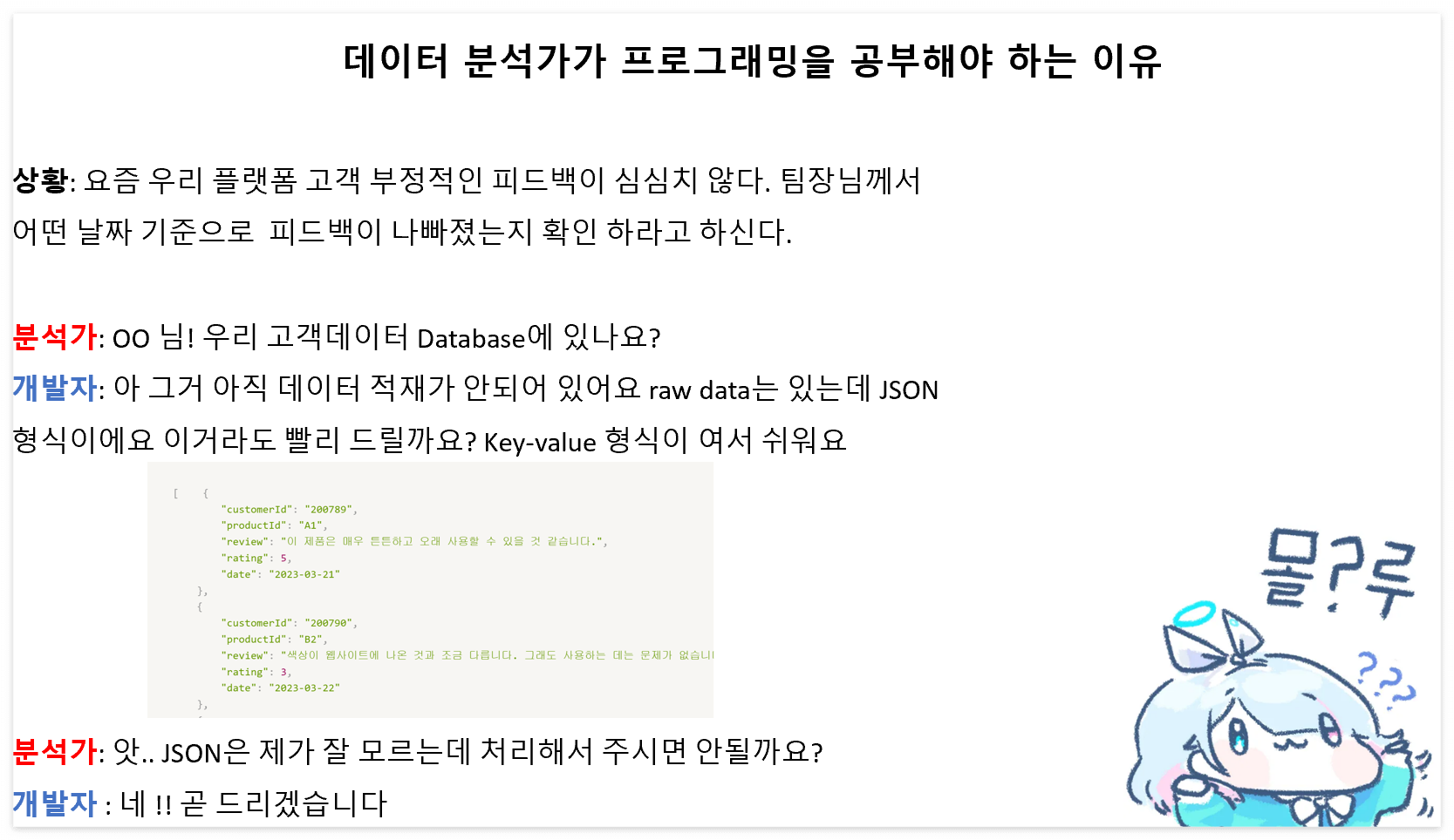 데이터 엔지니어는 개발자 트랙이니 말할 것도 없고 데이터 사이언티스트는 Python 프로그래밍으로 모델링을 하기 때문에 역시 필수적이다. 또한, 데이터 분석가는 업무에 이바지할 부분이 많다. 데이터 분석의 좁은 분야는 RDB(관계형 데이터베이스)기반에서 데이터를 뽑아내는 쿼리 작업부터 시작하고 그 부분에서 비즈니스적인 내용을 붙일지, A/B test를 포함한 통계를 붙일지 등등 뻗어나갈 분야는 많다. 어느 방향으로 주 분야를 뻗어 나가던 확실한 것은 Python과 같은 프로그래밍을 다룰 줄 아는 것은 업무 범위를 확장하기에 매우 좋다는 것은 사실이다.