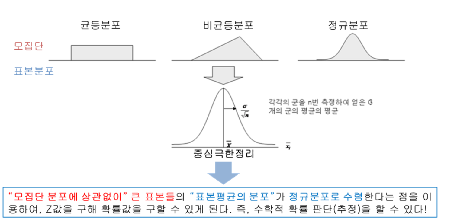 - 중심극한정리(Central Limit Theorem): 표본 크기가 커질 수록 표본분포가 정규분포를 따르는 경향