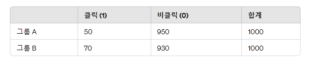 - 귀무가설: A버전과 B버전에는 클릭률의 차이가 없다.