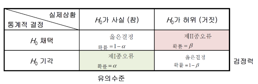 - 1종 오류: 귀무가설이 참인데도 불구하고 귀무가설을 채택하지 않는 오류