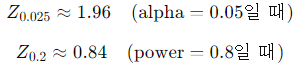 여기서 Z_alpha/2는 정규분포의 상위, Z_beta는 검정력의 하위 백분위수