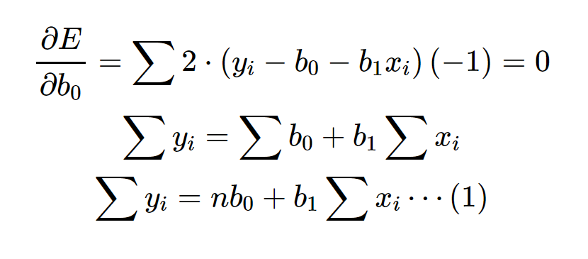 다시 말해 에러를 최소화하는 값은 (1), (2)식에 대한 해가 바로 우리가 찾으려고하는 b0와 b1이다. 해당 연립방정식을 정리하면 다음과 같은 식이 나오고