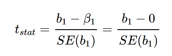 선형회귀에서도 t-test를 한다. 이때 귀무가설은 회귀계수 beta가 0이다 라는 것(다시말해 해당 독립변수는 종속변수에 아무런 영향이 없다는 것이며) 대립가설은 beta가 0이 아니다 라는 것이다. 따라서 검정통계량은 다음과 같이 설정한다.