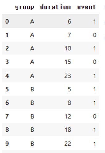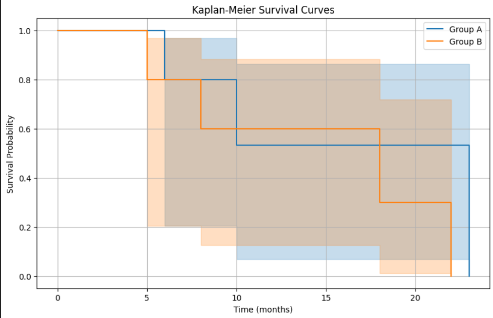- 따라서 그룹 A와 그룹 B의 생존 시간이 통계적으로 유의미하게 다르지 않음을 결론 지을 수 있음