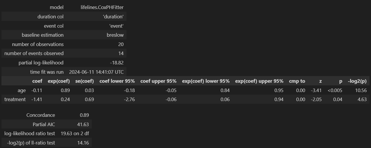 - treatment 치료여부는 회귀계수는 -1.41이로 치료를 받은 경우 사건 발생률이 감소한다는 것을 의미함. exp(-1.11) = 0.24이므로 치료를 받은 경우 사망확률이 약 76%씩 감소