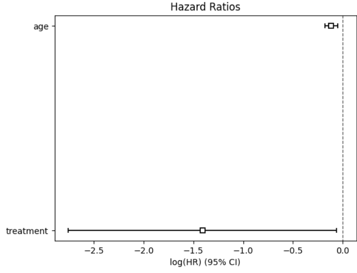 - 그래프의 경우 x축은 로그 위험비(log Hazard ratio)를 뜻하며 위험비의 추정값을 말한다. 0보다 작으면 사망위험확률을 낮춰준다고 해석할 수 있으며 age, treatment는 모두 사건 발생비율을 감소시킨다.