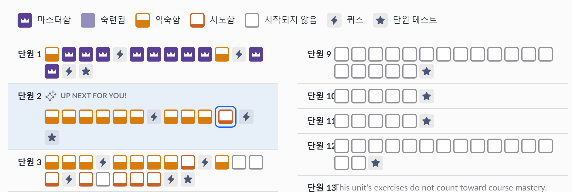 아래와 같이 진도가 표기되며 문제를 풀 수 있다. 문제 정답 수에 따라 등급이 올라간다. 중간 ⚡ 퀴즈 내용이며 ⭐ 는 단원 테스트이다. 단원테스트까지 완료하면 마스터 👑 배지가 수여된다. 만약 중간에 틀리더라도 다시 공부하여 맞추면 등급을 올릴 수 있다.