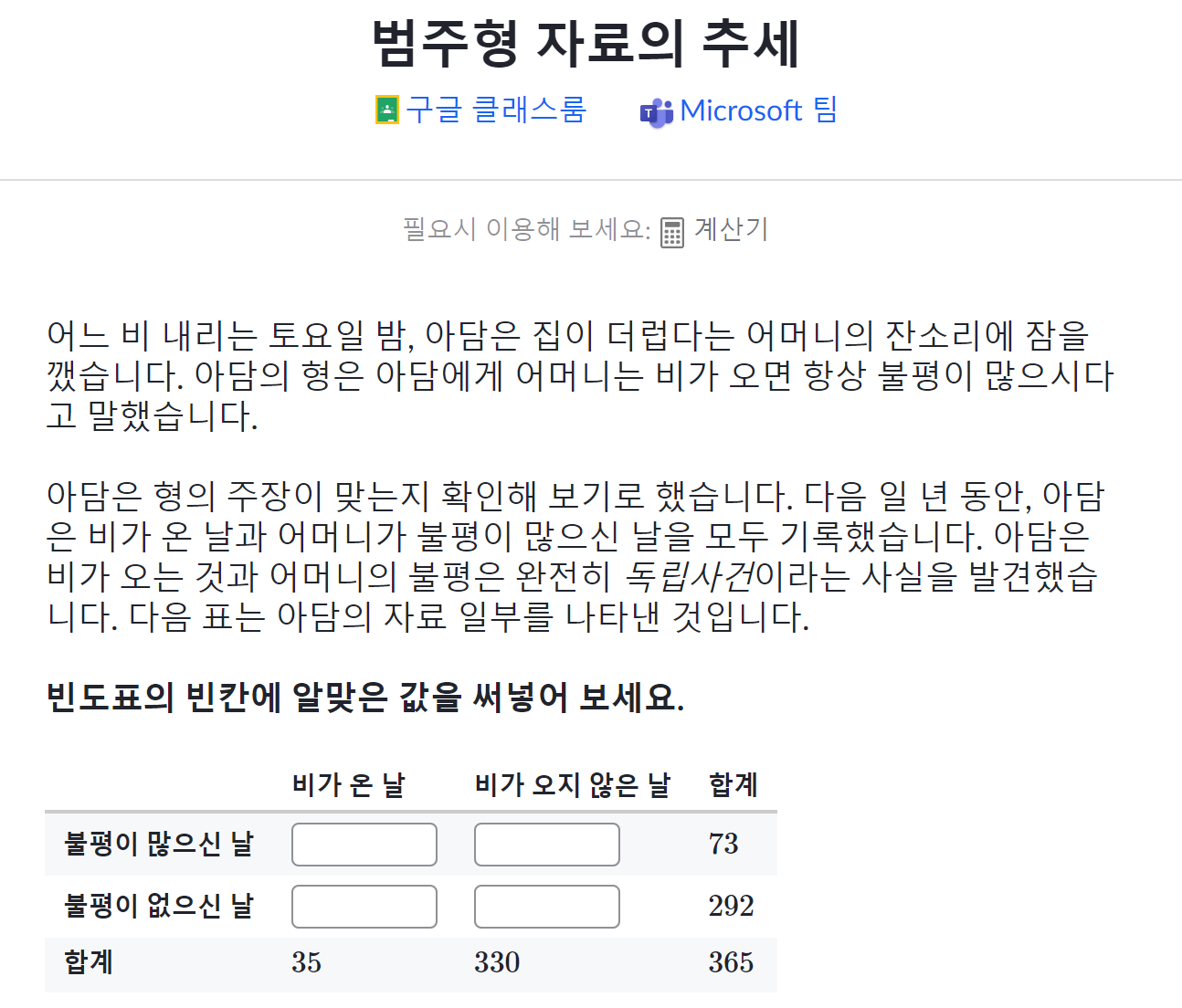 2단원은 이원도수분포표를 읽고 해석하는 소단원과 범주형 자료의 추세를 분석하는 문제가 나온다.