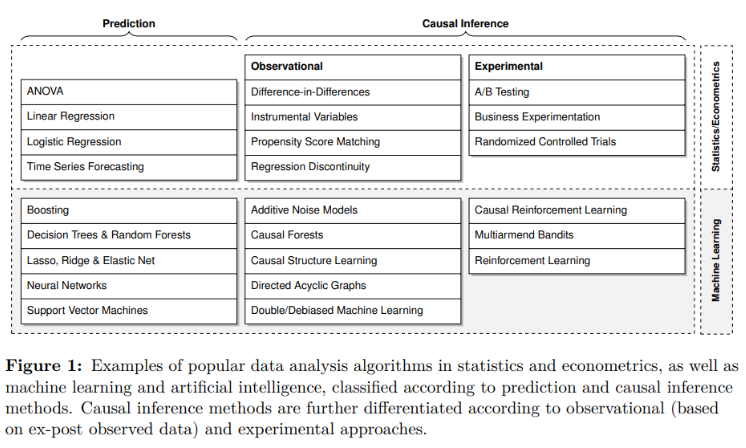 작년에 데이터분야에서 떠오르는 키워드였던 인과추론도 실험연구이다. 인과추론(Casual Inference)와 예측(prediction)은 서로 다른 개념이다. 인과추론은 말그대로 실험 연구의 한 분야이며, 그 관계를 입증하는데 목적이 있다. 반면 예측은 결과값을 정확하는게 목적이다. 종종 데이터분석을 공부하는 학생들은 예측모델링을 통해 통계분석을 한다고 생각하는데 실제로는 그렇지 않다. 다음 그림에 그 구분이 잘 되어있다.