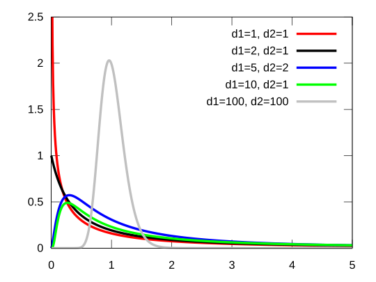 F분포는 두 개의 카이제곱 분포를 나눈 비율로 그룹 간 차이가 그룹 내 변동보다 얼마나 큰지를 나타내기 위해서 고안한 분포이다. 그룹 간의 차이가 단순이 우연에 의한 것인지 아니면 유의미한 차이가 있는지 판단하는데 사용된다. 다음은 2 그룹간 자유도에 따른 F분포이다.