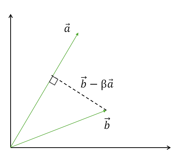 - 원리: 두 벡터가 있을 때, 한 벡터를 다른 벡터에 직교하는 벡터를 만들려면 어떻게 해야할까? 아래 $ \overrightarrow{b}$ 의 벡터를 $ \overrightarrow{a} $ 에 직교하도록 하려면, 상수배 ($\beta$)를 한 $ \overrightarrow{a}$를 만들고 두 벡터의 차이를 구하면 된다. 두 벡터의 차이가 직교하면 내적이 0 이되므로 다음 식이 성립한다.