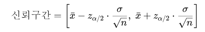 신뢰구간은 정규분포를 기반으로 계산되며, 이를 위해 Z-점수(Z-score)를 사용합니다. 전체 데이터의 95%정도만 설명한다고 하면 표준정규분포 Z score 를 기준으로 +- 1.96의 값에 해당하는 수치를 이용해서 신뢰구간 추정이 가능합니다.