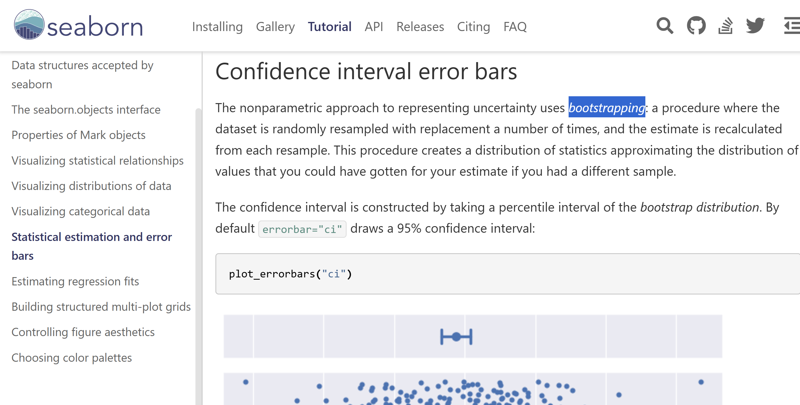 여담으로 Seaborn 의 Error bar 튜토리얼을 보면 신뢰구간(c.i.)를 부트스트래핑으로 계산된다는 걸 확인할 수 있습니다.