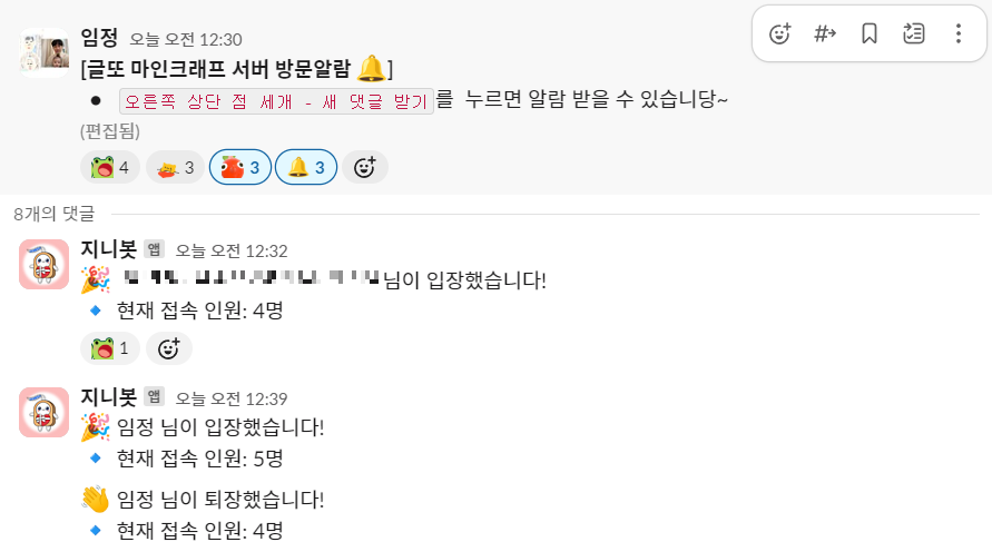 필자는 개발자의 글쓰기 모임인 글또10기에 참여하고 있으며 또한 운영진으로 활동하고 있다. 아무래도 개발자 기반의 커뮤니티다 보니까 글쓰는 활동이나 내부 커뮤너티 활동들을 봇을 이용해서 활용할 기회가 많다. 예를 들면, 글 제출을 한다던지 혹은 제출된 글에 대해서 LLM으로 피드백을 해준다던지 자동화가 되어 있는 기능들이 많다. 이번 글에서는 Customer Relational Managment(a.k.a. CRM) 운영진의 일환으로 설날 맞이 보낸 CRM 메세지와 게임채널에서 마인크래프트를 이용한 서버를 운영하고 출석체크 봇을 만든 경험을 남기고자 한다.