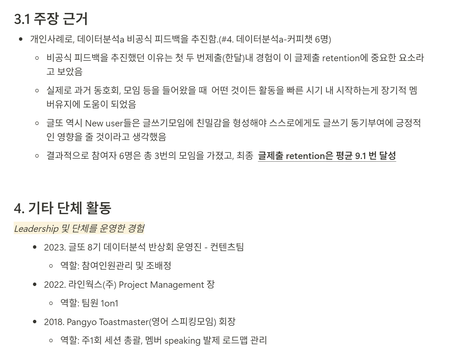 사실 이런 아이디어의 근간은 ChatGPT 가 활황이던 23년의 시대적 배경과 함께합니다. 8기 쯤하여 AI 코딩 어시스트 기술이 발전하고 대부분의 IT직군들이 일자리를 잃지 않을까하는 두려움에 다들 만나서 ChatGPT과 일자리에 대한 논의가 활발했습니다. 또한, 이직이나 조직생활 나아가서 밥먹고 사는 문제까지 다들 모여서 고민을을 나누는 시간들이 빈번했습니다. 저는 이런 자유로운 토론과 대화가 글또의 가치를 사용자들에게 주는 경험이라고 생각했고, 이를 좀 더 Global하게 키우는 것이 장기적으로 사용자의 리텐션 향상에 도움이 될 것이라는 가설을 세웠습니다. 실제로 지난 8기에서 오프라인으로 만난 참여자 6명은 글제출을 9.1번으로 평균 이상의 활동량을 보임을 확인했습니다. 이러한 경험을 바탕으로 다음 지원서를 작성했습니다.