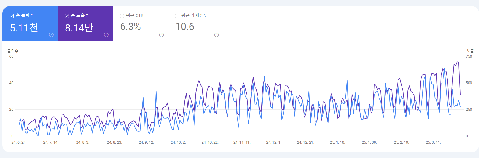 두번째로는 노출과 CTR입니다. 점점 글을 작성하면서 알게모르게 블로그의 랭크가 높아졌고, 메타 태그 설정, 구글 서치콘솔까지 연결하니 가장 인기 있는 글은 13%의 CTR를 달성하기도 했습니다.