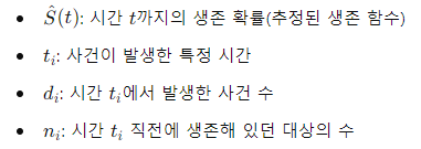 - 특정 시간까지 이벤트가 발생하지 않을 확률(생존 함수)을 비모수적으로 추정하는 방법