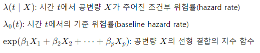 - 기준위험률(λ0(t)): 시간 t 기준 위험률로 공변량의 영향을 제거한 상태의 기본적인 위험률