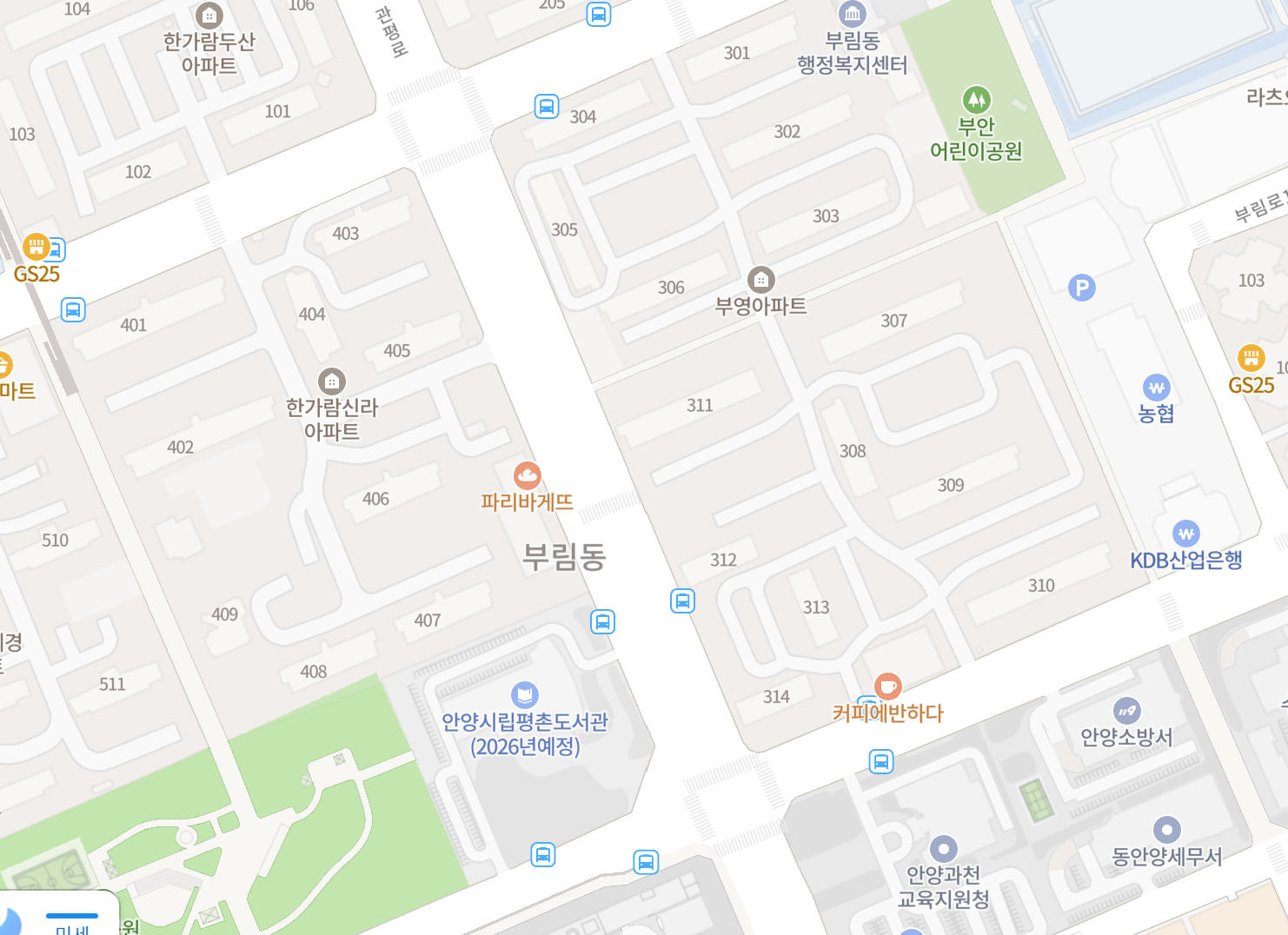 - 횡단보도 바로 앞에 카페, 빠리바게트 등의 소규모 상가가 있으며, 도서관은 현재 운영 X