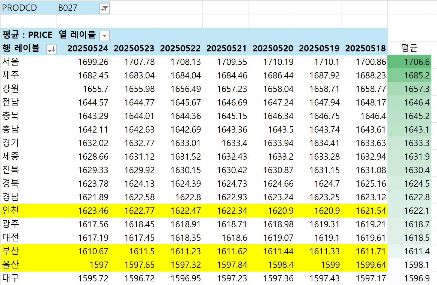 - 기준일자 지역코드, 지역명, 제품구분, 평균가격