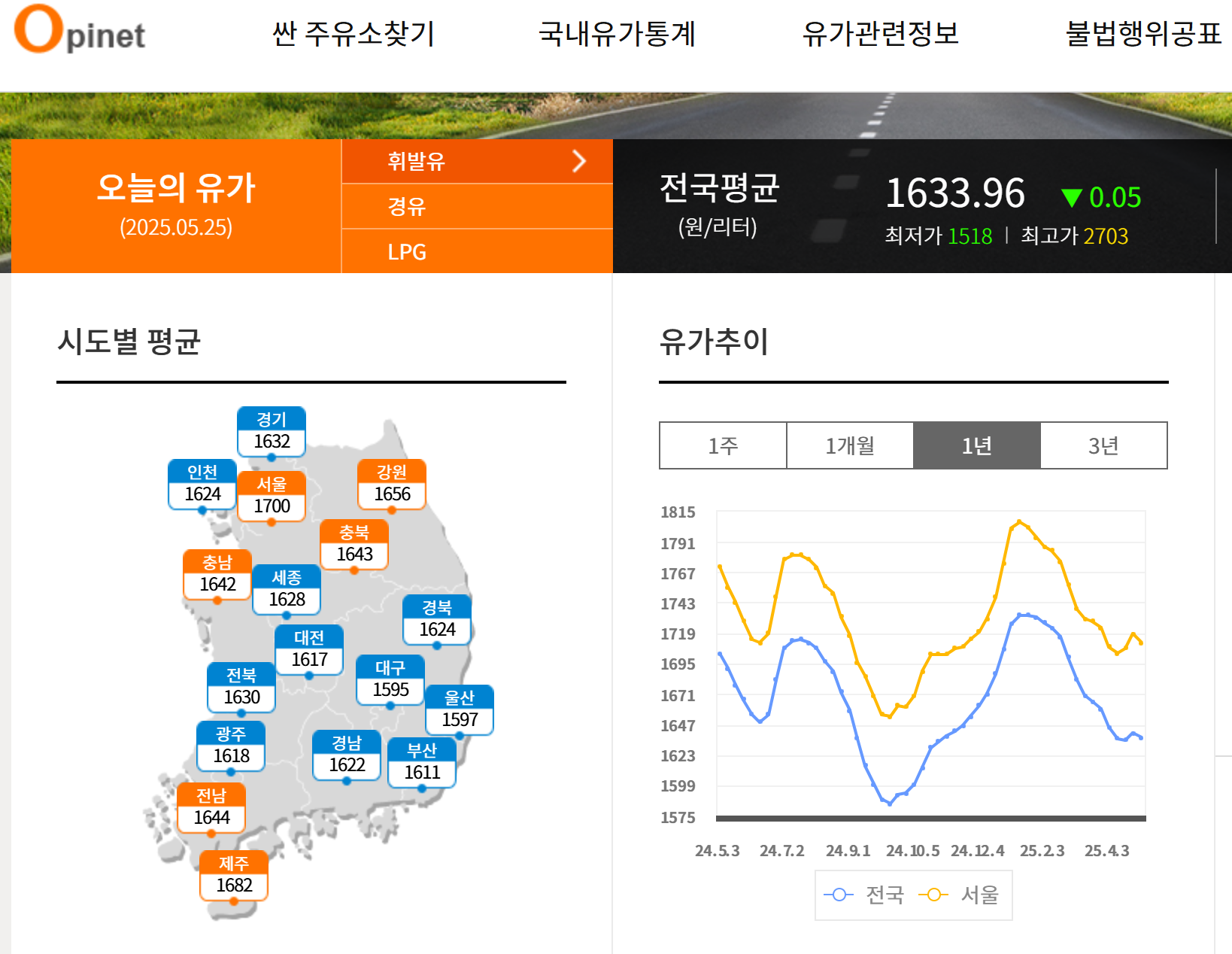 - 전국 평균 1,633원, 서울 1,700원 vs 경기 1,632원 vs 인천 1,624원