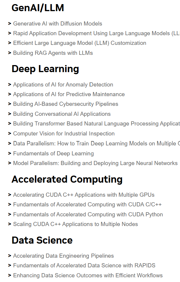 큰 카테고리는 4가지(Gen Al/LLM, Deep Learning, Accelerated Computing, Data Science) 로 그 안에 세부 내용이 있습니다.