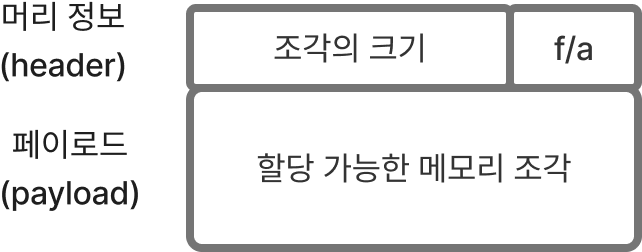 1. 메모리의 유휴 여부를 확인하는 것은 메모리의 header 영역과 payload 영역을 따로 설정하여 정보를 나타나게 하였습니다. free/allocated 를 뜻하는 f/a 영역에 메모리의 사용 여부를, 조각의크기를 저장하여 메모리의 사용정보를 나타냈습니다.