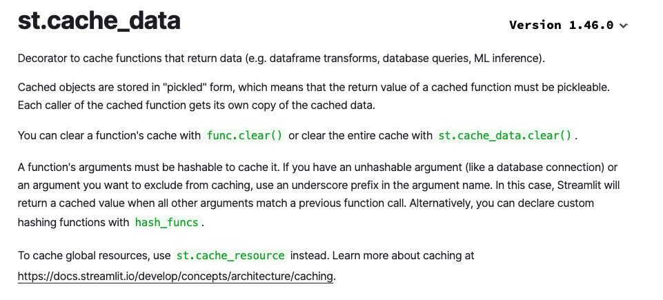 - 기본적으로 streamlit은 메모리에 데이터를 저장하며 캐싱을 통해 데이터를 추가로 불러올 필요없이 사용할 수 있다. "캐싱"이라는 방법을 쓰는 것이지 앞에서 서술한 캐시-메모리의 구조를 분할하여 쓰는 것은 아니다.