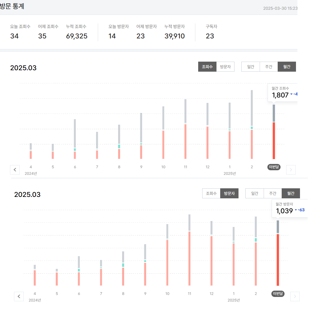 직무에 대한 고민 글과 프로젝트, 스터디를 하면서 올라간 내면의 질적인 향상도 있지만 명시적으로 오른 지표는 방문자 수와 조회 수입니다. 월 천명, 조회수 2천건의 블로그로 성장했습니다. 데이터 분야 입문할 때만해도 Ratsgo's Blog나 어쩐지 오늘은 같은 데이터 블로그 글들로 공부를 많이했는데 어쩌면 저도 그런 블로그가 될 수 있을까 싶습니다 ㅋ_ㅋ