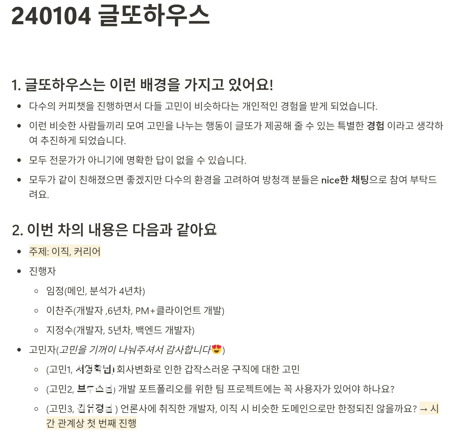 위 고민을 담아 9기에서 글또하우스를 2회 개최했습니다. 지난 서비스 "클럽하우스" 본따 소수의 스피커와 다수의 청중으로 이루어진 고민상담소로 기획했습니다. 실제로 좋은 반응을 보였고, 1회에는 53명이 지원할 들어올정도로 많은 호응을 받았습니다. 이때 몇가지 회고를 하자면