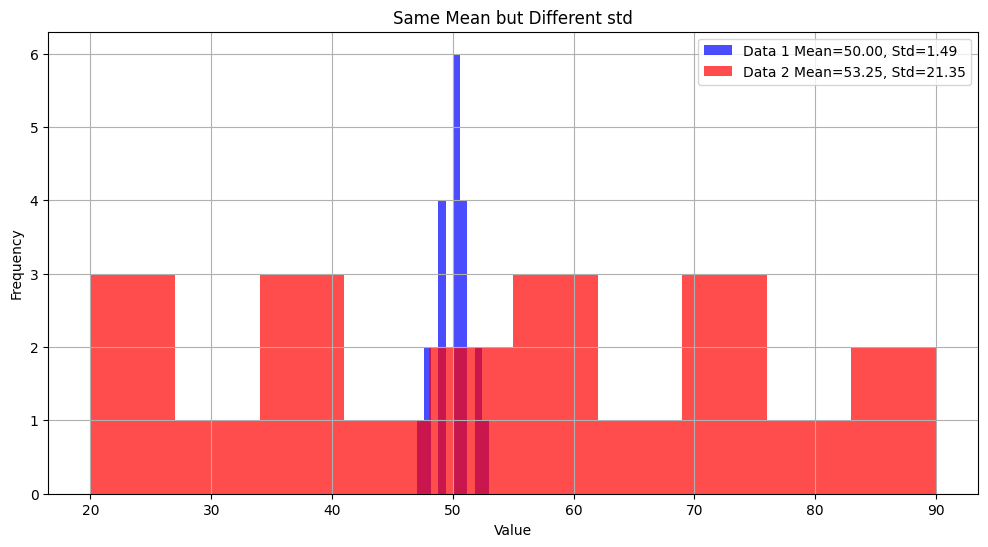 그런데 단순히 표본평균이 같다는 이유로 같은 분포라고 할 수 있을까? 라는게 구간 추정의 등장의 이유입니다. 데이터의 산포도(분산이나 표준편차)가 다르다면, 평균만으로는 데이터를 완전히 설명하기 어렵기 때문입니다. 구간 추정은 이러한 불확실성을 포함하여 데이터를 표현하는 방법론으로 등장하게 되었습니다. 다음은 두 평균이 비슷한 두 데이터가 산포도가 다른 예시입니다.
