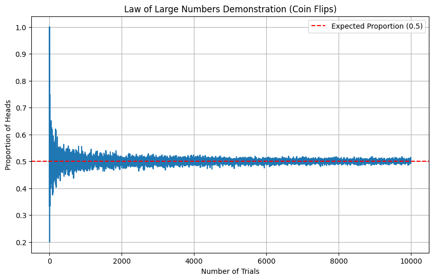 통계학의 기본은 모집단을 알아내는 방법론입니다. 하지만 모집단에 대한 전수조사가 불가능에 가깝기 때문에 표본을 가지고 모집단에 대한 특징 평균,표준편차를 구하는 것이 추론통계의 기초라고 하겠습니다 . 표본데이터로 모평균은 쉽게 구할 수 있는 법칙이 있는데 Law of Large Number 라는 대수의 법칙으로 표본 평균은 표본의 크기가 증가할수록 모평균에 수렴하는 경향을 나타낸다는 법칙입니다. 다음은 대수의 법칙을 확인하기 위하여 동전 뒤집기를 예시를 10000번 수행해가면서 평균이 0.5로 수렴하는 그래프입니다.