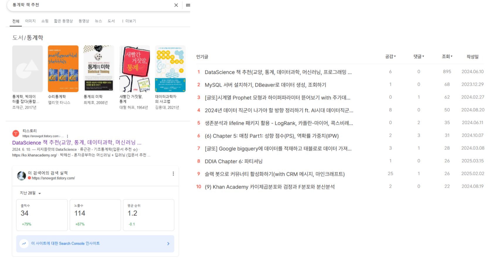 물론 일반 웹서비스와 다르게, 기술블로그 특성상 적절한 주제라고 생각하면 클릭으로 전환하는 비용이 크지 않기 때문에 큰 값은 아니지만 그래도 꽤나 전환율이 좋은 글들이 많습니다. 특히 통계책으로 검색하면 일반 서점 사이트와 교수님이 쓰신 글! 까지 제치고 상위노출하는 쾌거를 이루어서 기분이 좋았네요.