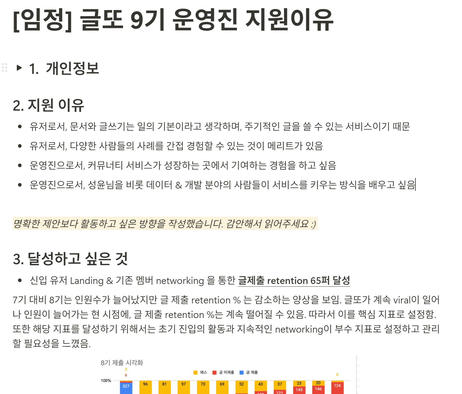 사실 이런 아이디어의 근간은 ChatGPT 가 활황이던 23년의 시대적 배경과 함께합니다. 8기 쯤하여 AI 코딩 어시스트 기술이 발전하고 대부분의 IT직군들이 일자리를 잃지 않을까하는 두려움에 다들 만나서 ChatGPT과 일자리에 대한 논의가 활발했습니다. 또한, 이직이나 조직생활 나아가서 밥먹고 사는 문제까지 다들 모여서 고민을을 나누는 시간들이 빈번했습니다. 저는 이런 자유로운 토론과 대화가 글또의 가치를 사용자들에게 주는 경험이라고 생각했고, 이를 좀 더 Global하게 키우는 것이 장기적으로 사용자의 리텐션 향상에 도움이 될 것이라는 가설을 세웠습니다. 실제로 지난 8기에서 오프라인으로 만난 참여자 6명은 글제출을 9.1번으로 평균 이상의 활동량을 보임을 확인했습니다. 이러한 경험을 바탕으로 다음 지원서를 작성했습니다.