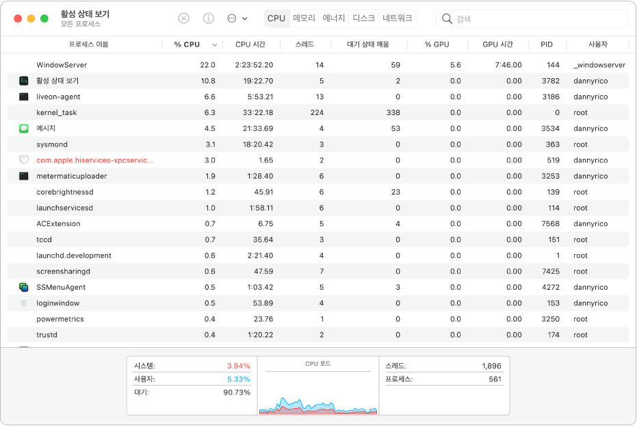 컴퓨터 자원 확인: Command + space -> 활성 상태 보기