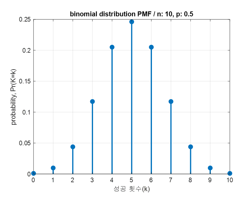 이항분포(binomial distribution): n번 시행에서 성공한 횟수에 대한 분포(유의어: 베르누이 분포)