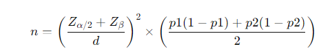이항 분포를 따르는 두 그룹의 비교를 위해 표본 크기를 계산하는 공식은 다음과 같습니다