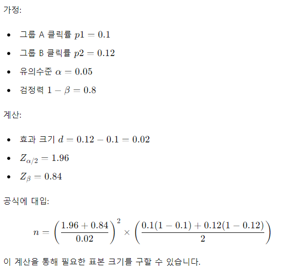 데이터 수집: 일정 기간 동안 각 버전의 클릭률을 측정. 예를 들어, A 버전은 1000명의 방문자 중 50명이 클릭, B 버전은 1000명의 방문자 중 70명이 클릭