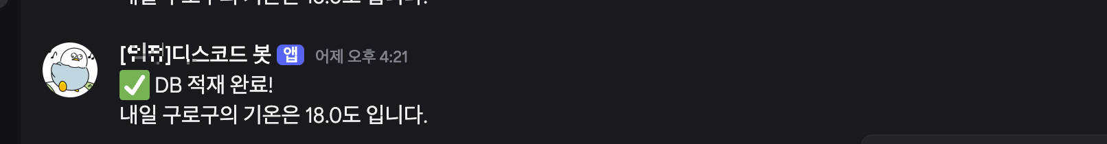 3일간 단기 특보를 이용하여 구로구의 내일 정오 날씨를 알려주는 앱을 만든다고 생각해봅시다. 이를 반영하기 위하여 이 파이프라인은 매일 오후 11시에 실행되어 그다음날 구로구의 정오 온도(12시)를 저장하고 알림을 주며, 데이터에 저장합니다.