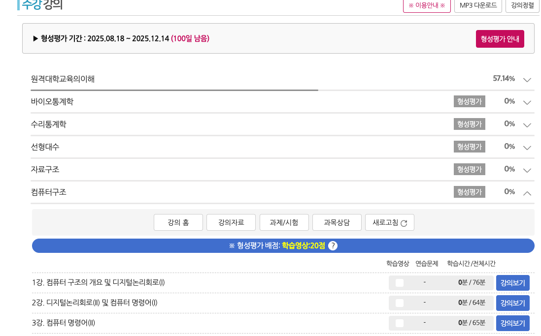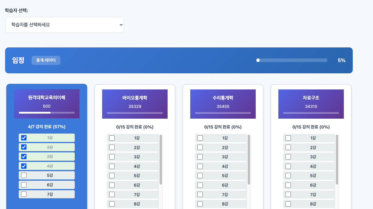 전체 과목의 진척사항 확인개별 강의의 수강 체크