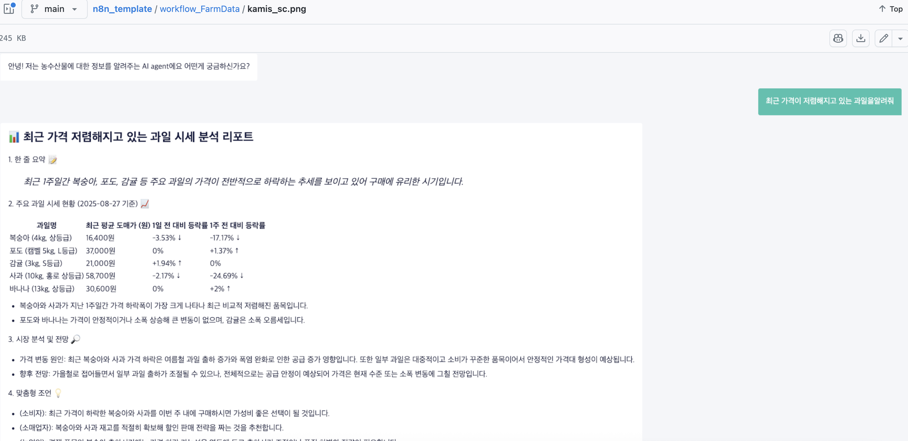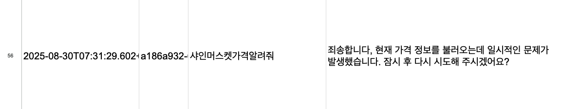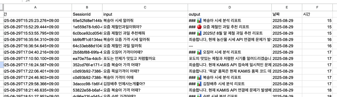 기본 프로덕트는 엄청 간단하게 만들어서 헛점이 많았습니다. 먼저 사용자가 챗봇으로 요청할 때마다 농수산물 품목에 대한 조회가 재현성이 없다는걸 확인했습니다. 아무래도 직거래 시장에서 발생한 데이터를 조회하다 보니 제철이 아닌 과일인 경우 조회하지 못하는 문제가 발생했습니다. 사실 이걸 보완하기 위해서 프롬프트로 "만약 조회 결과가 없다면 이전의 결과를 조회해"라는 식으로 넣었지만 아무래도 조건문이 아닌 프롬프트로 만들다보니 재현성이 떨어졌습니다.