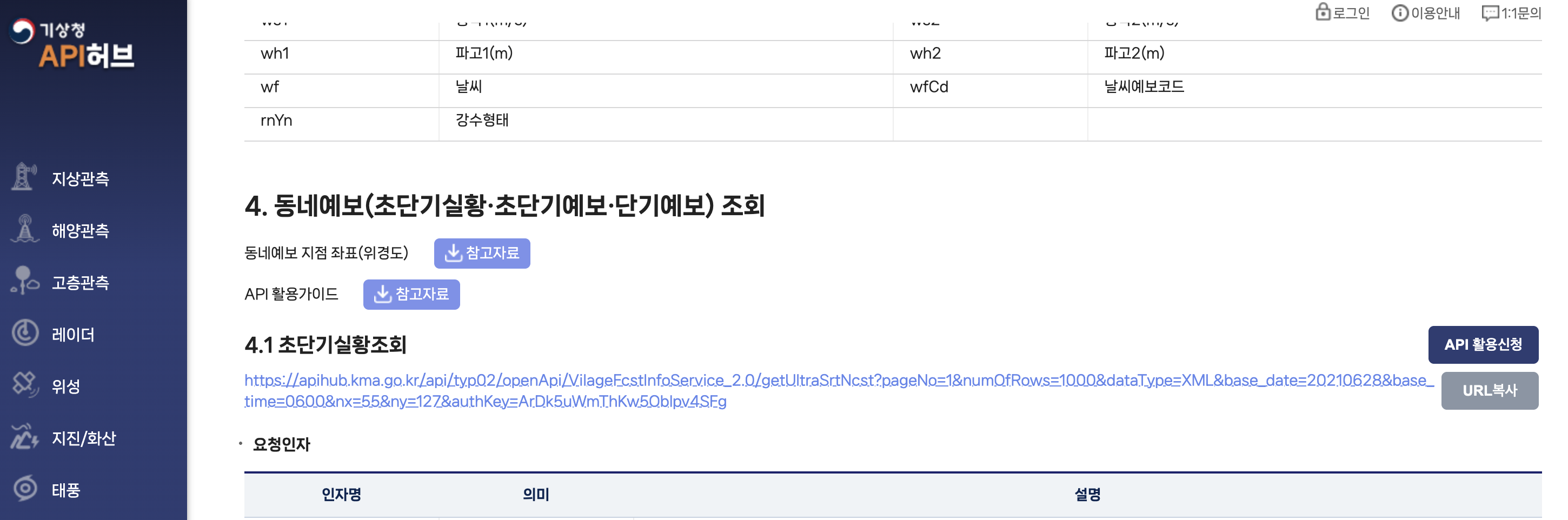 본 글에서는 (1) 기상 API 데이터 처리 (2) Airflow 설치 및 실행 (3) Supabase 저장 (4) Discord 알림 각 단계를 간단하게 세팅하는 것을 3단원에서 소개합니다. 마지막으로 최종 파이프라인을 위한 환경세팅과 코드를 4단원에서 기술합니다. 데이터는 기상청 API 허브의 예특보 - 4. 동네예보 - 3. 단기예보 조회를 활용할 예정입니다. 3일간의 기상 상황에 대한 정보로 특정 위치(x,y)좌표를 기준으로 기온, 풍속 하늘 상태 등에 대한 정보를 전달해 줍니다.