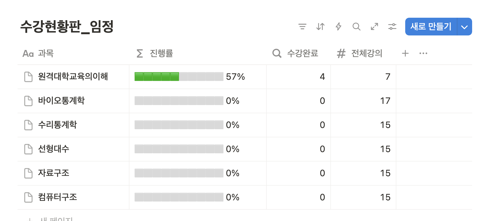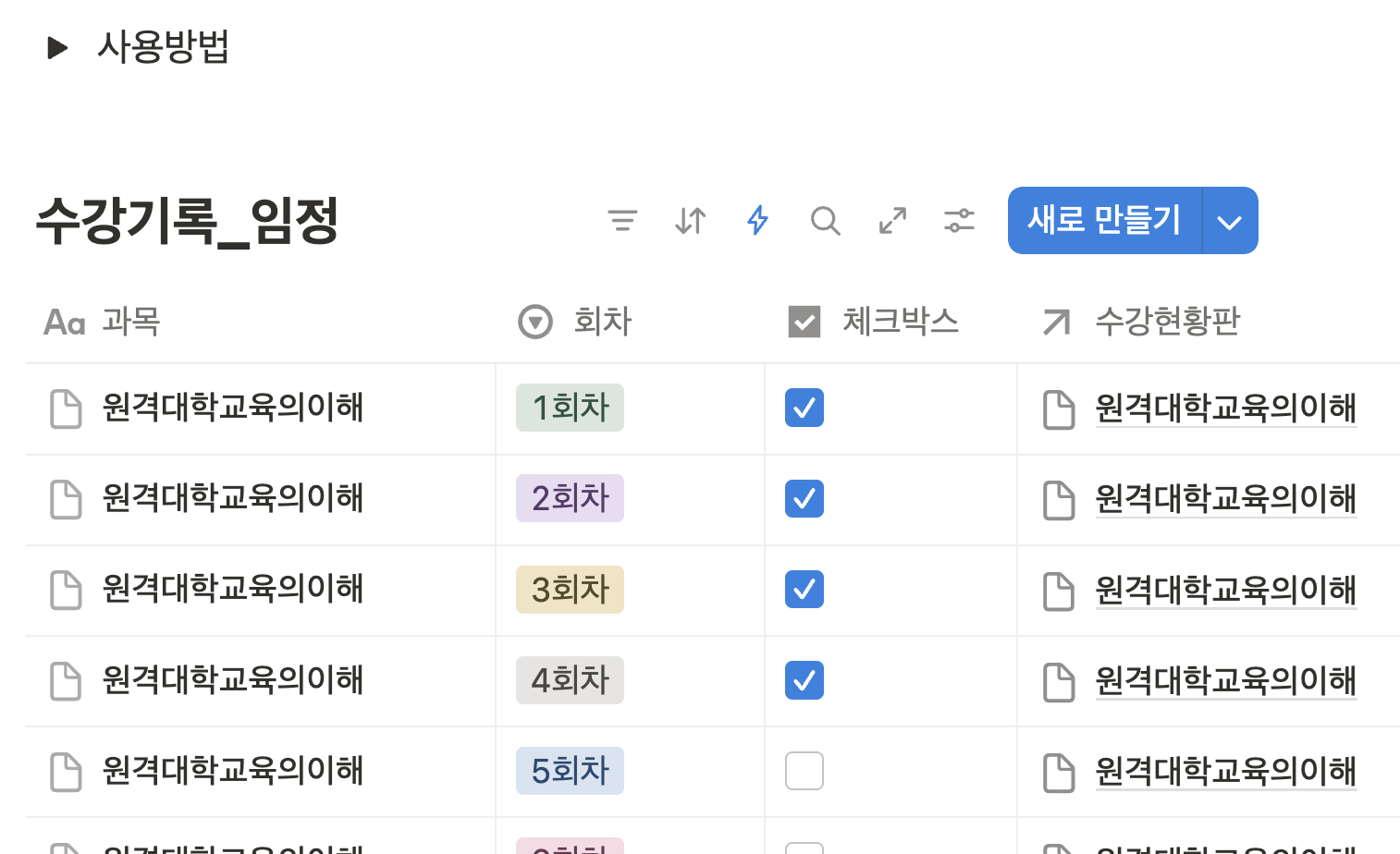 하지만 노션은 신규등록자 입장에서 되게 불편했습니다. 가이드 영상을 고사하더라도, 나의 새로운 과목을 추가할때 15개씩 수강기록을 남겨야했고(자동화를 통해 1~15회차가 자동으로 만들어지지만) 체크박스 하나씩 클릭하자고 수강기록을 만드는 것도 썩 맘에 들지 않았습니다. 그래서 그냥 웹서비스를 하나 만들자라는 결론에 도달했습니다.