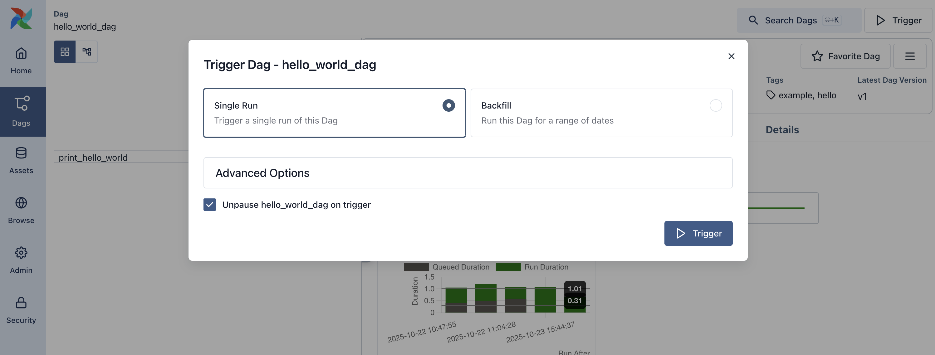 Dag 탭에 들어가 hello_world_dag를 검색하여 우측 상단 Trigger를 눌러줍니다. 여기서 Airflow3.0 변경점으로 Single Run과 Backfill 선택할 수 있는 팝업이 뜹니다. Single Run을 클릭합니다.