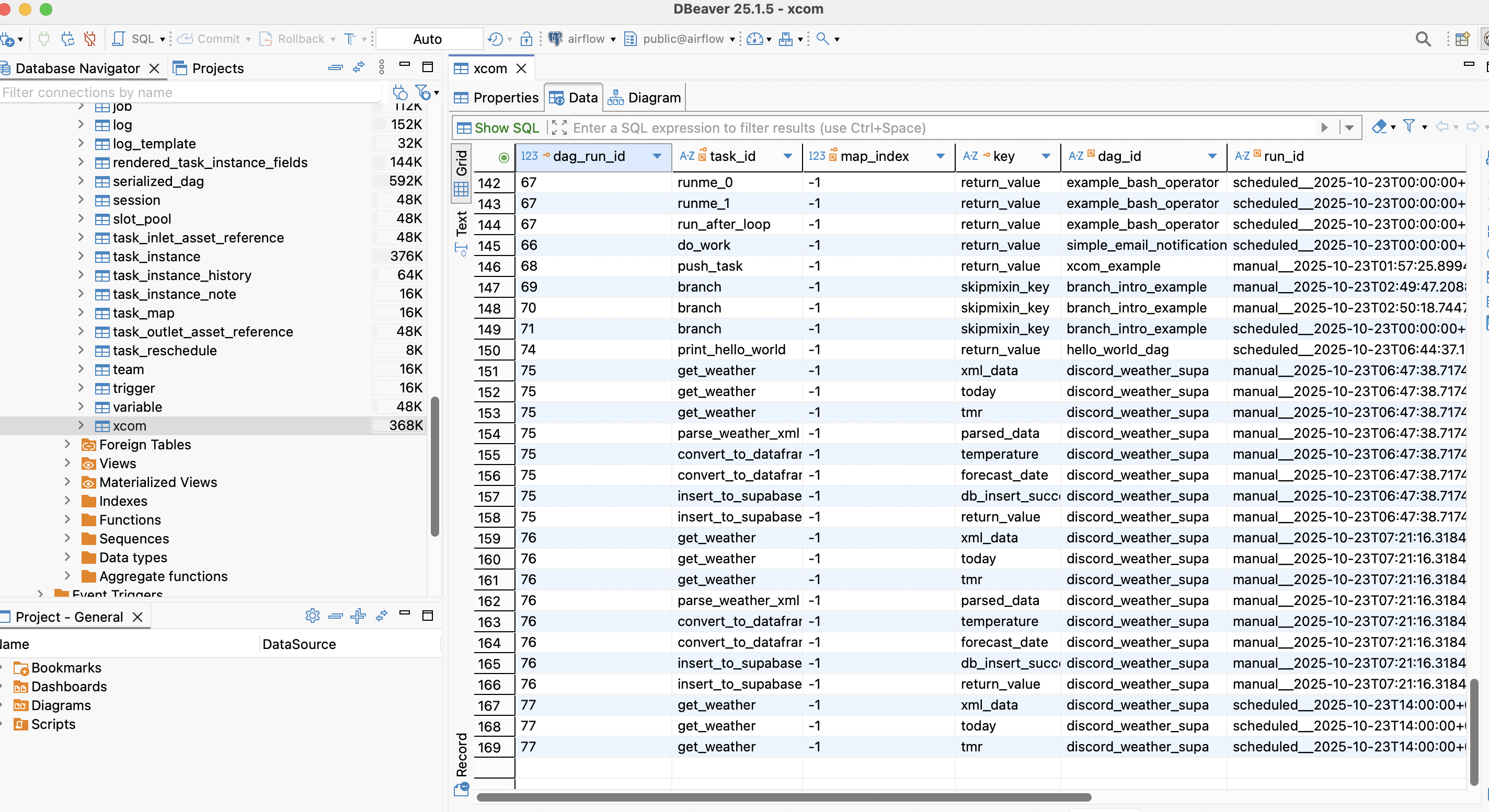개인적으로 Xcom은 WebUI로 보는 것보다 DBeaver 같이 어플리케이션으로 조회하는 것이 사용성 측면에서는 더 좋았습니다. 이 경우 airflow.cfg 파일에서 MetaDatabase의 포트를 외부(5432)로 열어줘야 연결 가능합니다.